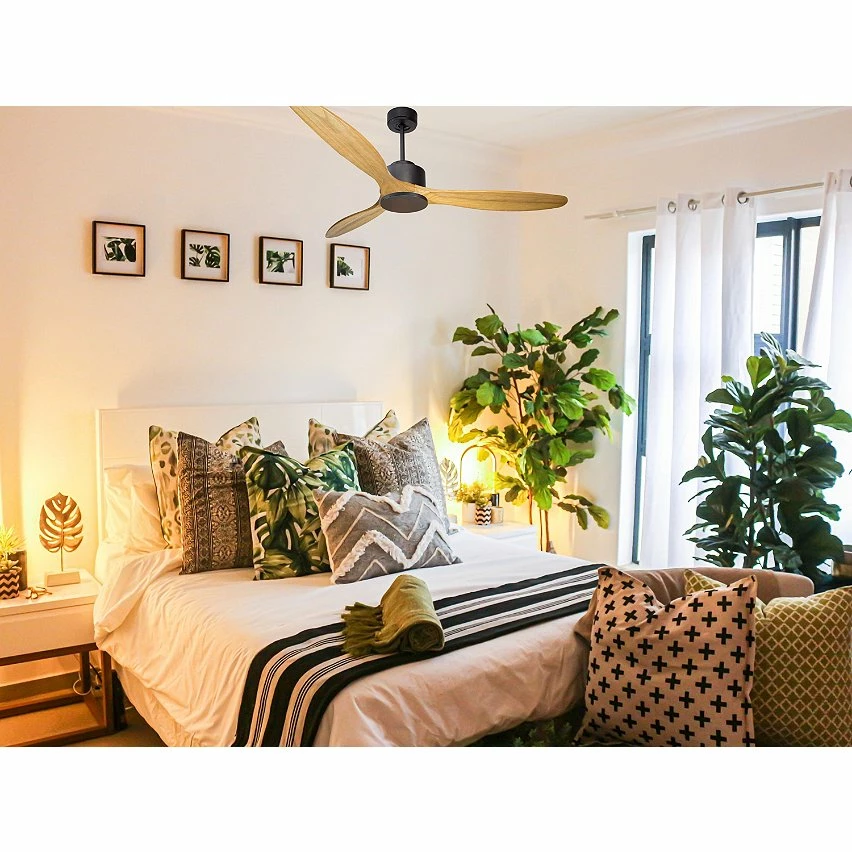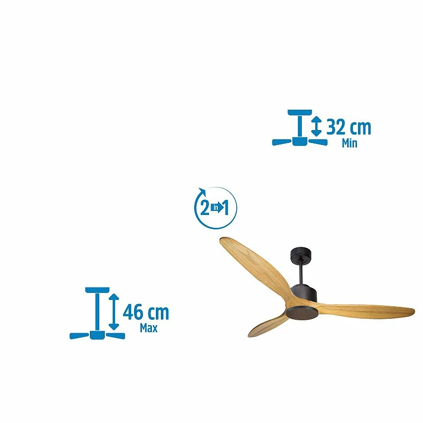 Le moteur à courant continu noir DC1 permet des installations dans les plafonds jusqu’à 27º d’inclinaison et est servi avec deux tiges pour être installé à la hauteur appropriée (13,5 cm et 25 cm). Il est parfait pour 2 ou 3 pales, car il dispose d’une fonction auto équilibrée. Il prend également en charge le kit de lumière. Ce modèle est réversible, de sorte qu’en hiver, vous pouvez inverser ses pales pour que son mouvement déplace l’air chaud vers le bas, agissant en complément de votre système de chauffage et favorisant une consommation optimisée. Il comprend également un thermostat à sa base, de sorte que vous pouvez le programmer pour que le ventilateur fonctionne en fonction de la température ambiante.