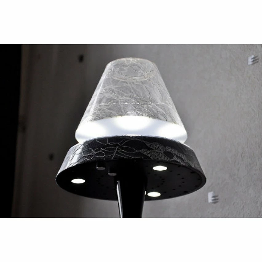 Cette lampe de salon est constituĂ©e d’un pied au design travaillĂ© supportant une bonne assise avec une finition peinture noire brillante. L’abat-jour de la lampe est dĂ©corĂ© sur tout son pourtour d’arabesques faites d’une fine dentelle posĂ©e sur un support conique en plastique transparent.
