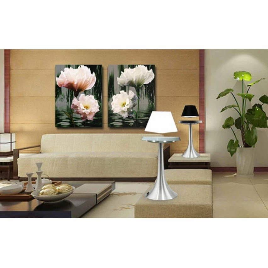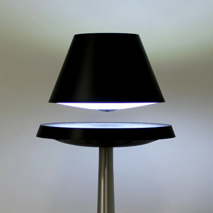 La lévitation de l’abat-jour repose sur le phénomène de sustentation électromagnétique. Un champ électromagnétique est généré par le courant électrique au niveau du socle de l’abat-jour. Ce champ magnétique repousse et stabilise ainsi l’aimant à 2 cm de hauteur.