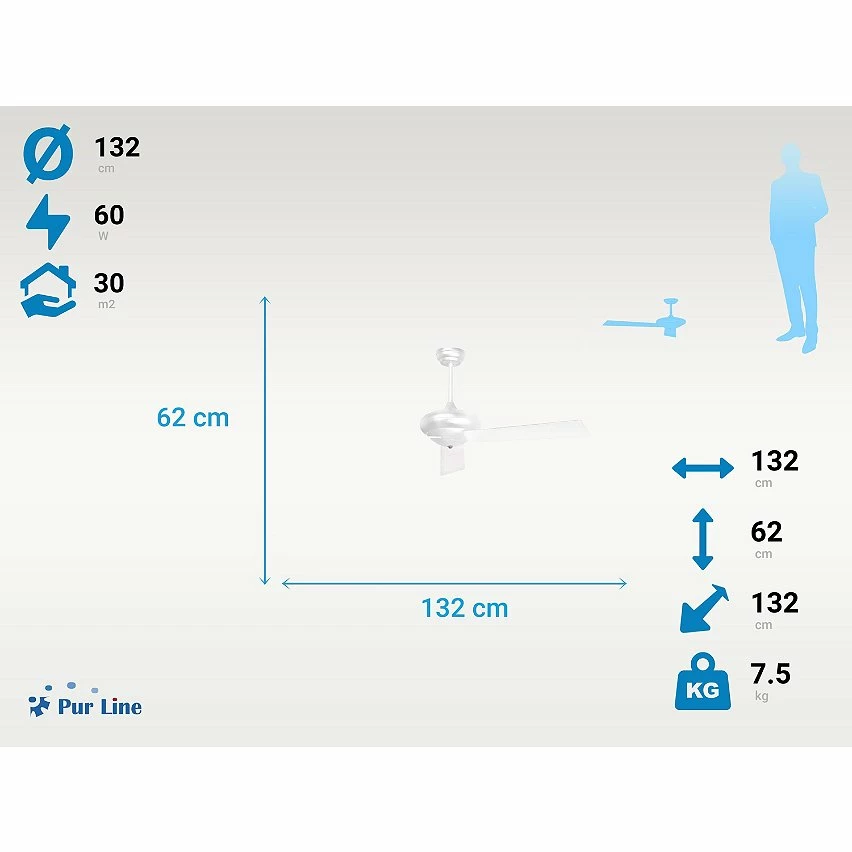 Son design blanc est simple, moderne et léger. Sa hauteur (62cm), son poids (7,5kg), ses 3 pales en blanc et argent et son diamètre (132cm) le rendent idéal pour les pièces jusqu’à 40m2. Parmi ses accessoires, vous trouverez un kit d’installation et une commande murale.